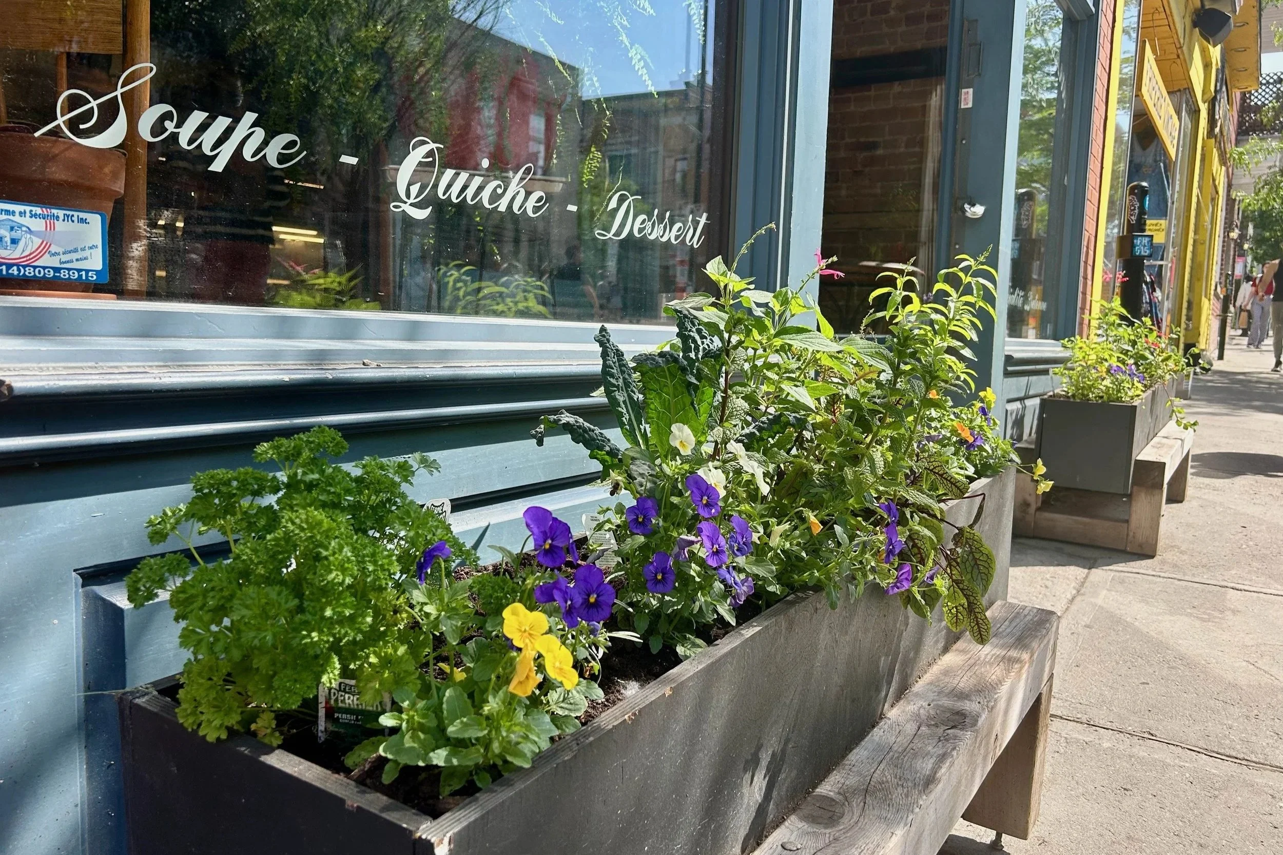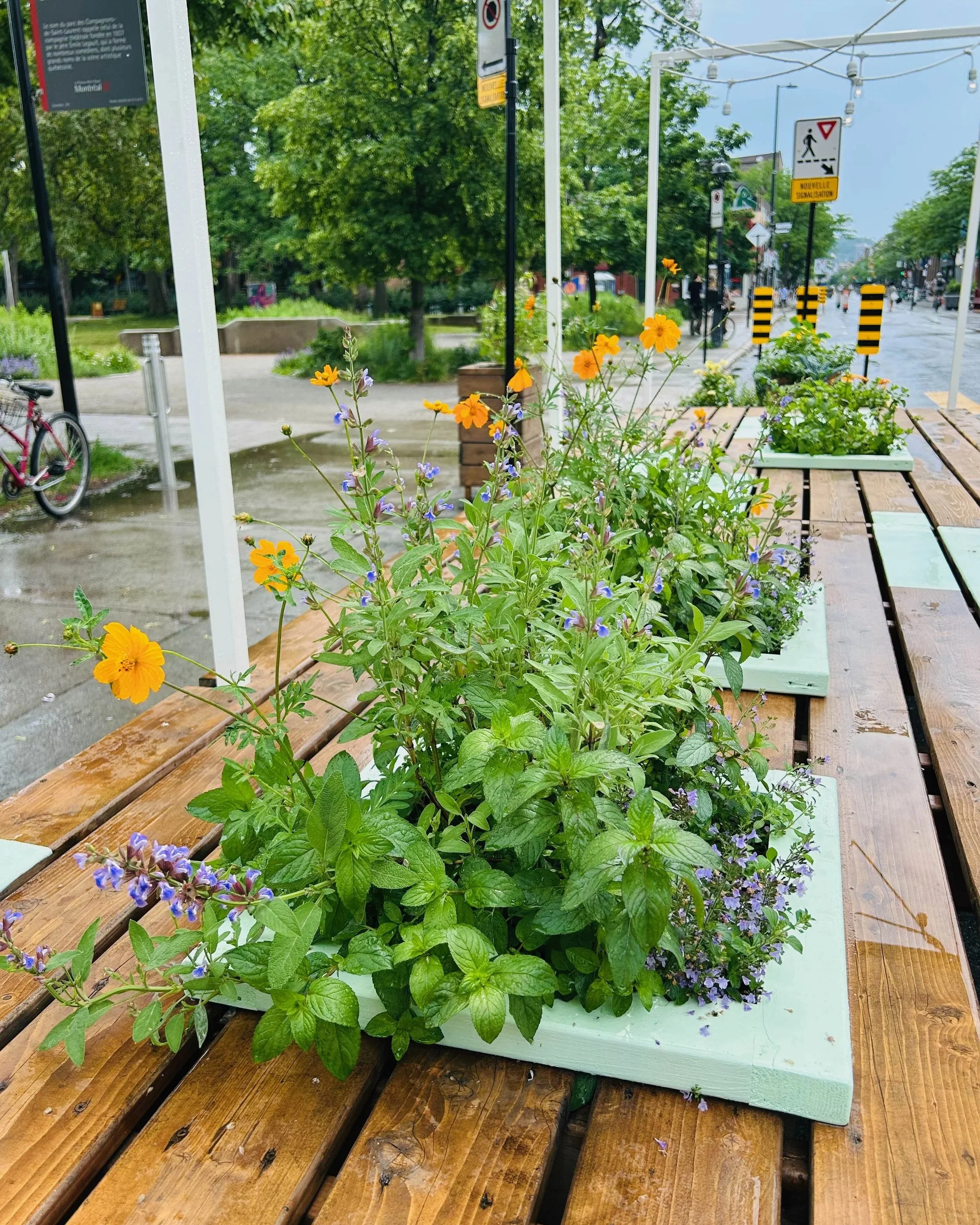 Piétonne, l’Avenue du Mont-Royal s’anime d’un flot continue de visiteurs et compte de nombreux projets de verdissement. En 2025, les bacs des commerçants et la table du comité proposent nos plantations 100% comestibles et biologiques.